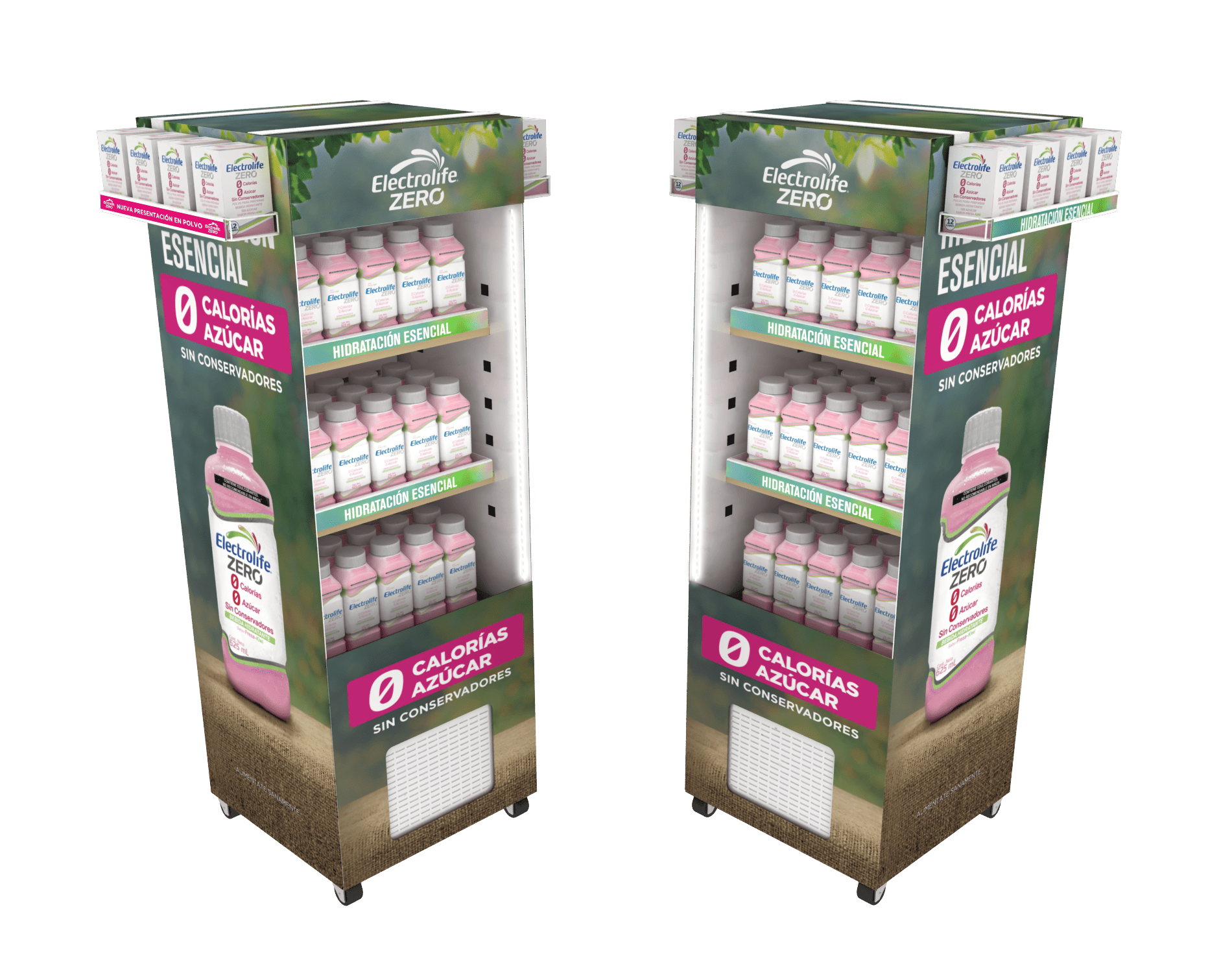 A partir de cartón impreso (Freshboard) y estructura de refrigeración eléctrica montada en un núcleo compacto, diseñamos y producimos Coolios (exhibidores que enfrían) específicos para bebidas rehidratantes. La solución combinó: